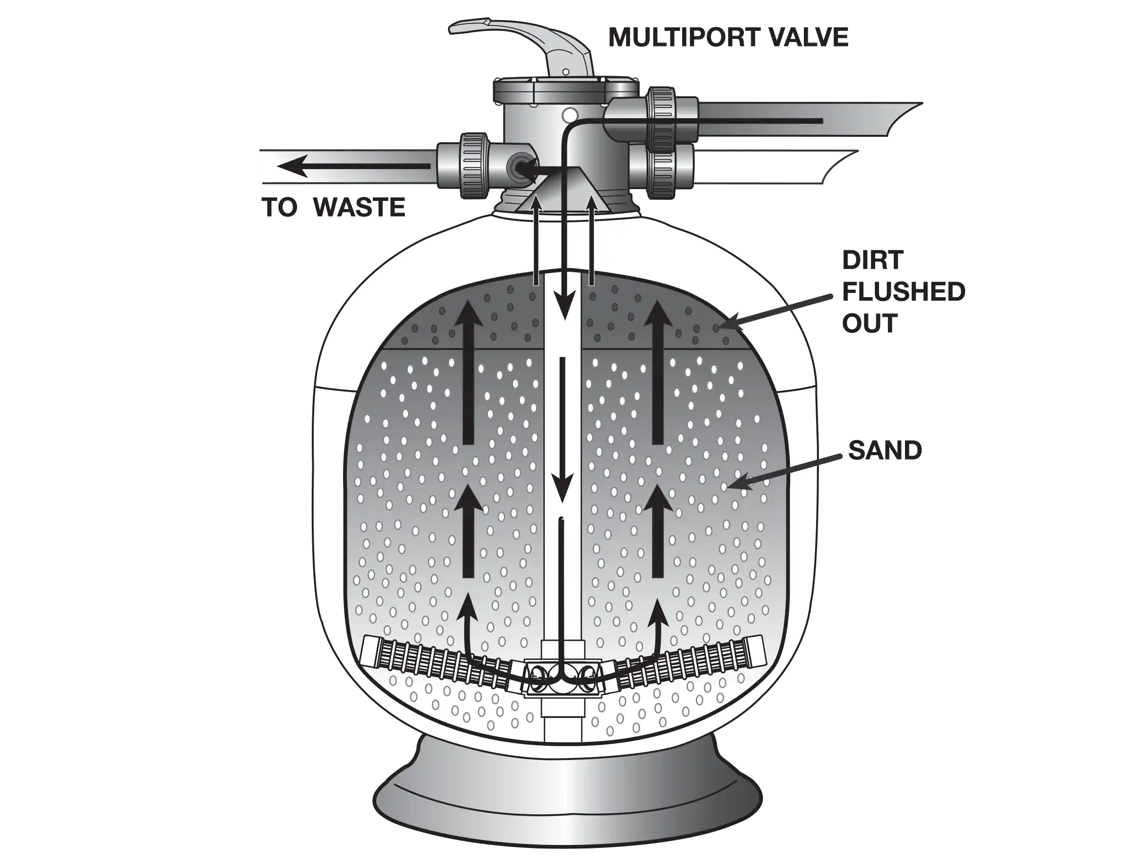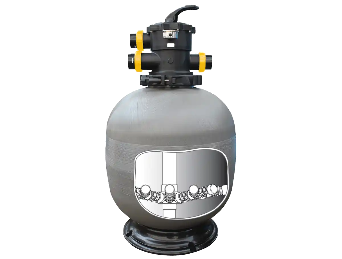 The CrystalClear ER Media Filter uses ‘depth filtration,’ where dirt is pushed through the filter bed and trapped in tiny spaces between the filter media particles. This process allows clean water to flow through the filter’s laterals and exit via the Multiport valve.